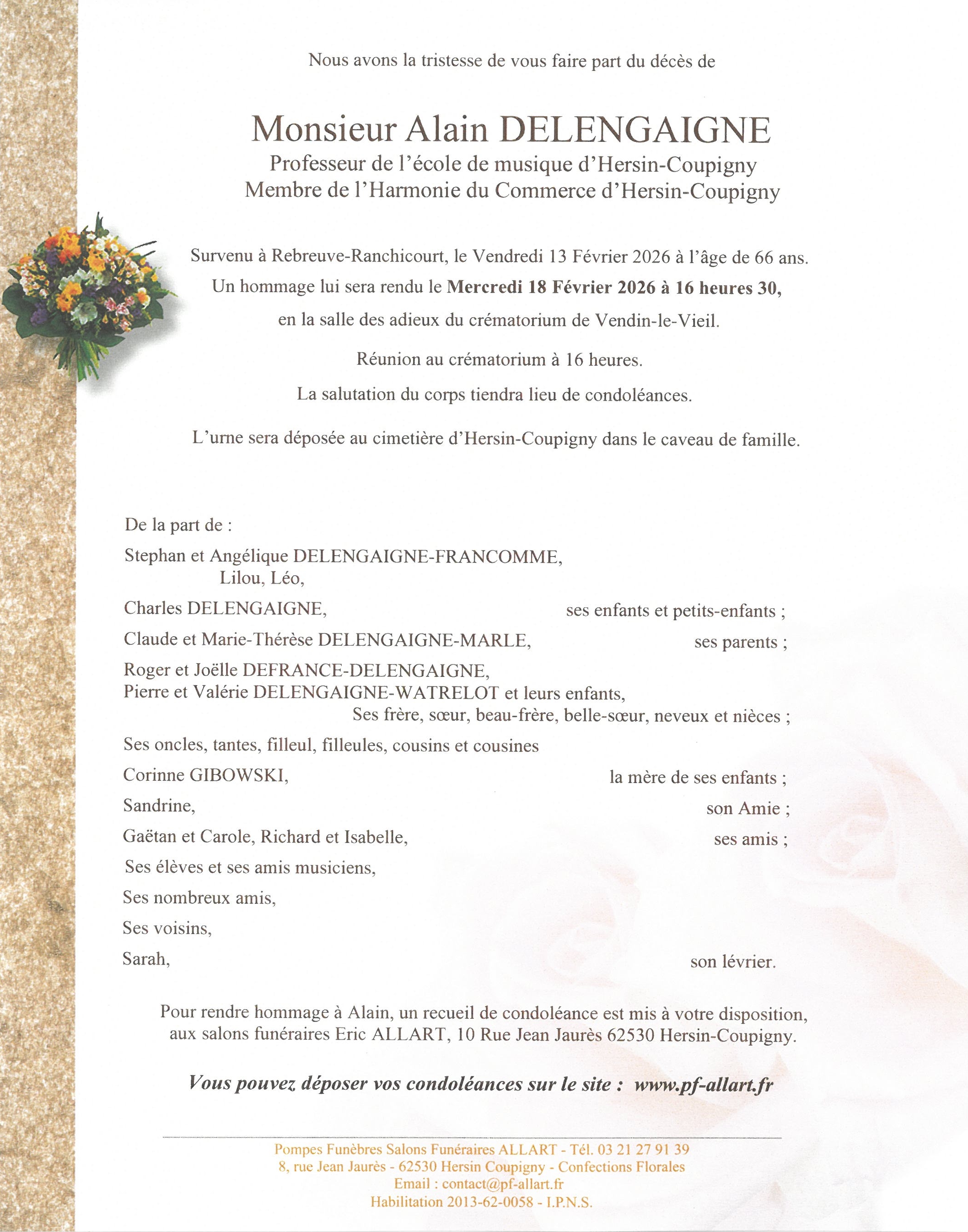 C’est avec une grande tristesse que nous vous annonçons le décès d’Alain DELENGAIGNE survenu le vendredi 13 février 2026 à Rebreuve-Ranchicourt.