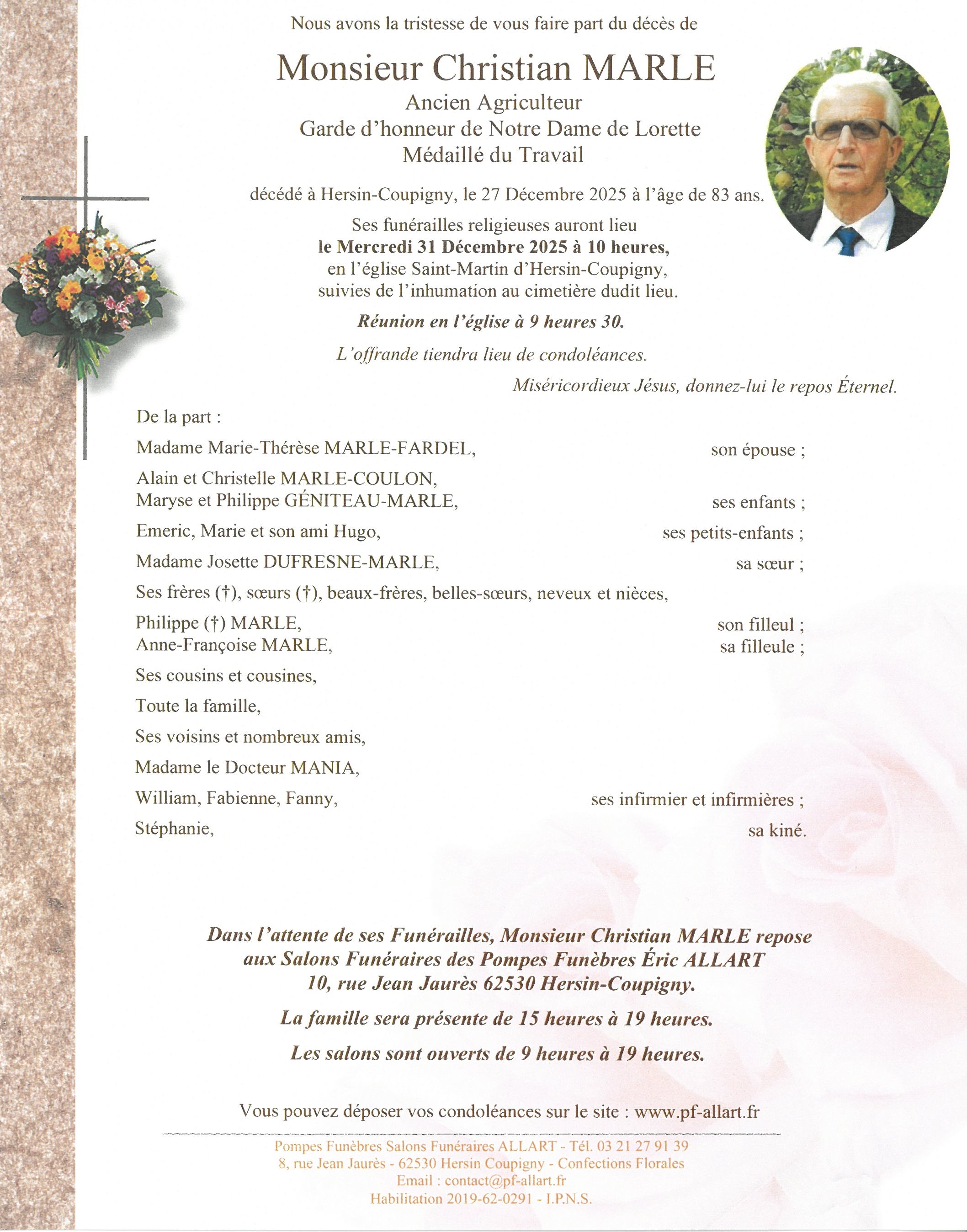 C’est avec une grande tristesse que nous vous annonçons le décès de Christian MARLE survenu le samedi 27 décembre 2025 à Hersin-Coupigny. La cérémonie se déroulera le mercredi 31 décembre 2025 à 10h00 à l’adresse suivante : Eglise St Martin - 62530 Hersin-Coupigny.