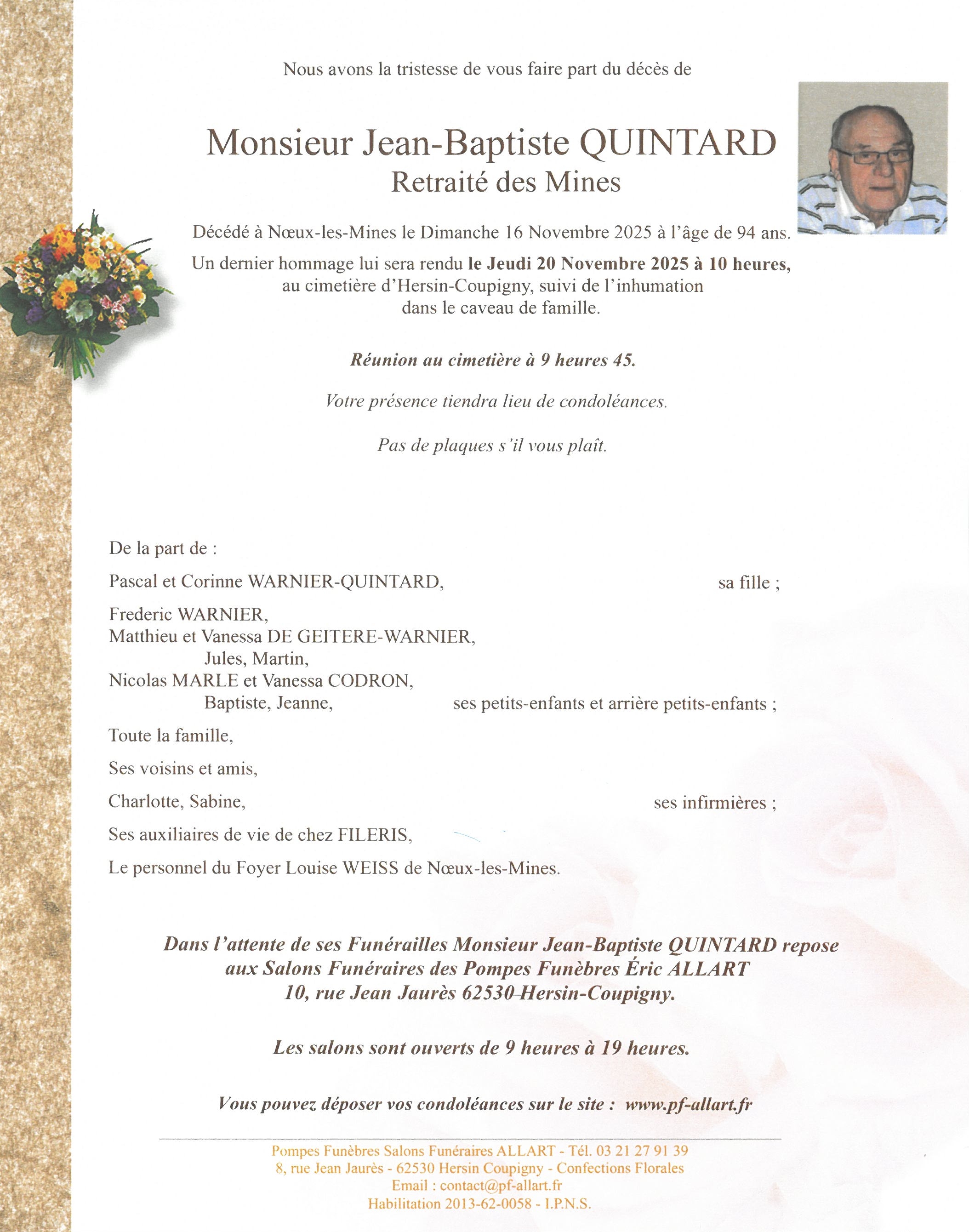 C’est avec une grande tristesse que nous vous annonçons le décès de Jean-Baptiste QUINTARD survenu le dimanche 16 novembre 2025 à Noeux-les-Mines. La cérémonie se déroulera le jeudi 20 novembre 2025 à 10h00 à l’adresse suivante : Cimetière - Rue de l'Égalité Hersin-Coupigny - 62530 Hersin-Coupigny.