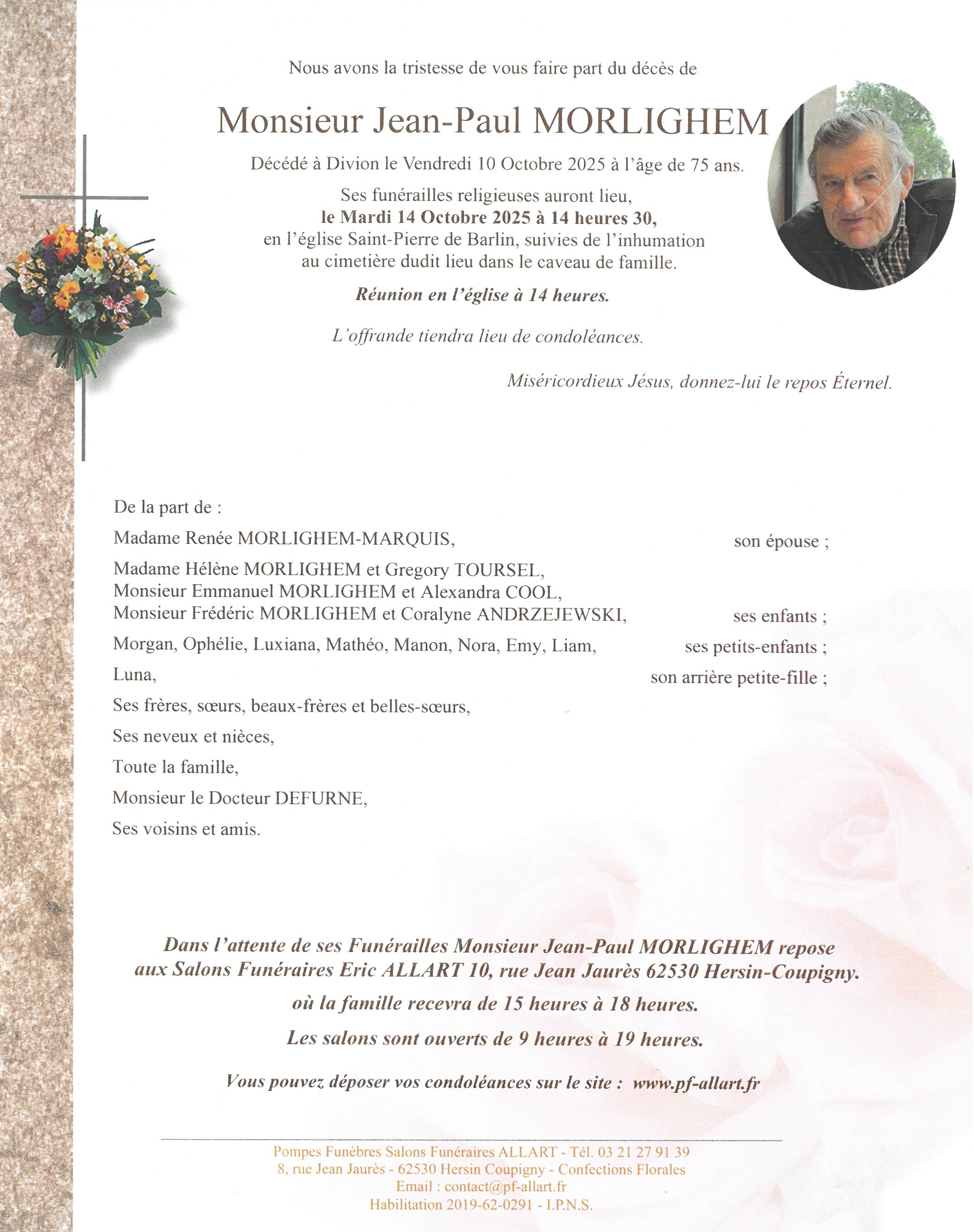 C’est avec une grande tristesse que nous vous annonçons le décès de Jean Paul MORLIGHEM survenu le vendredi 10 octobre 2025 à Divion.
