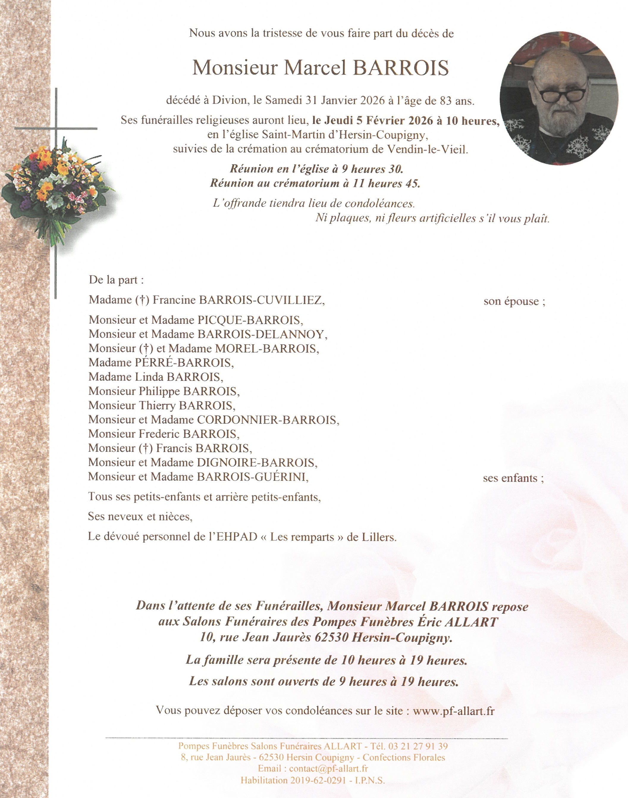 C’est avec une grande tristesse que nous vous annonçons le décès de Marcel BARROIS survenu le samedi 31 janvier 2026 à Divion. La cérémonie se déroulera le jeudi 05 février 2026 à 10h00 à l’adresse suivante : Eglise St Martin - 62530 Hersin-Coupigny.