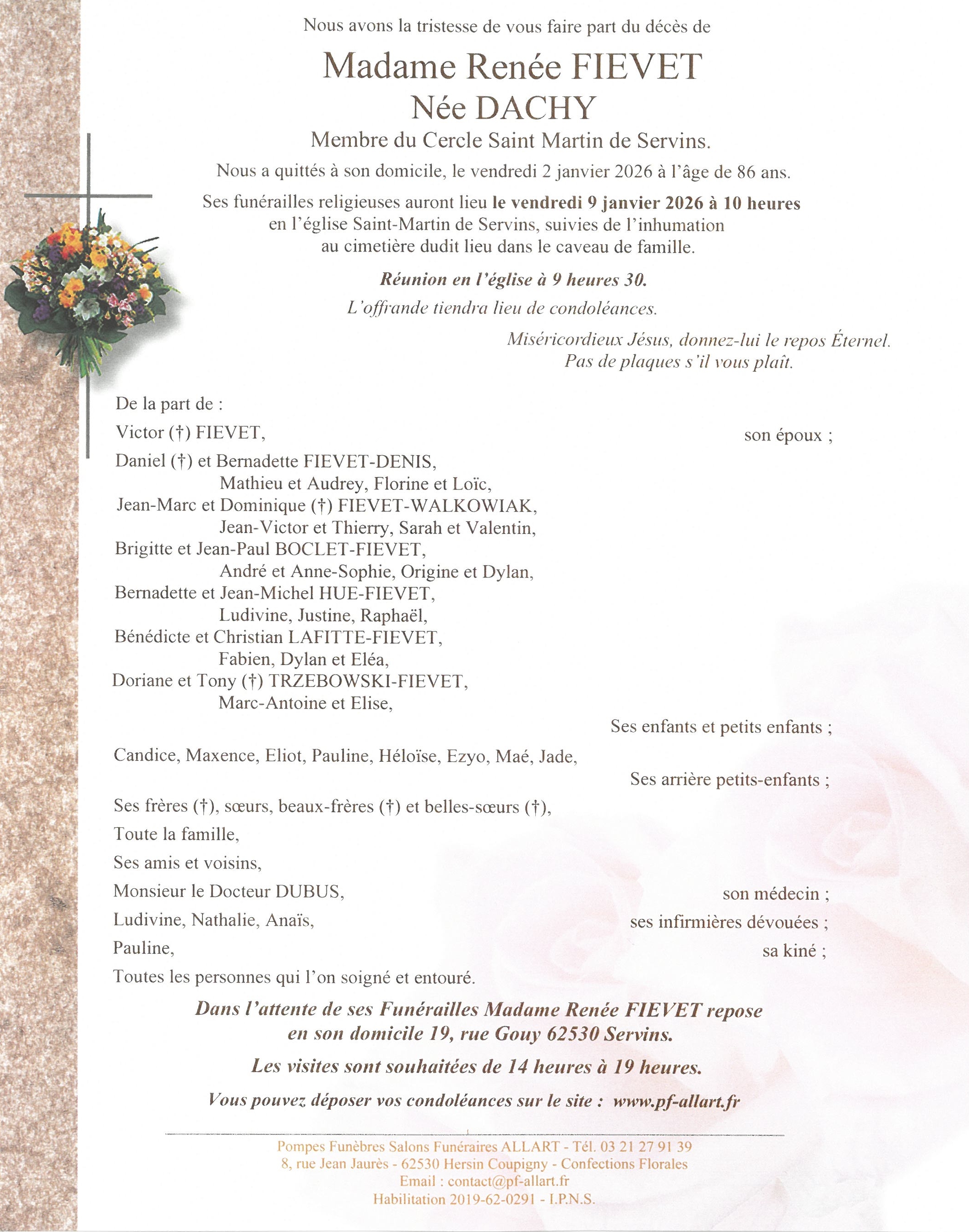 C’est avec une grande tristesse que nous vous annonçons le décès de Renée FIEVET survenu le vendredi 02 janvier 2026 à Servins. La cérémonie se déroulera le vendredi 09 janvier 2026 à 10h00 à l’adresse suivante : Église Saint Martin - 62530 Servins.