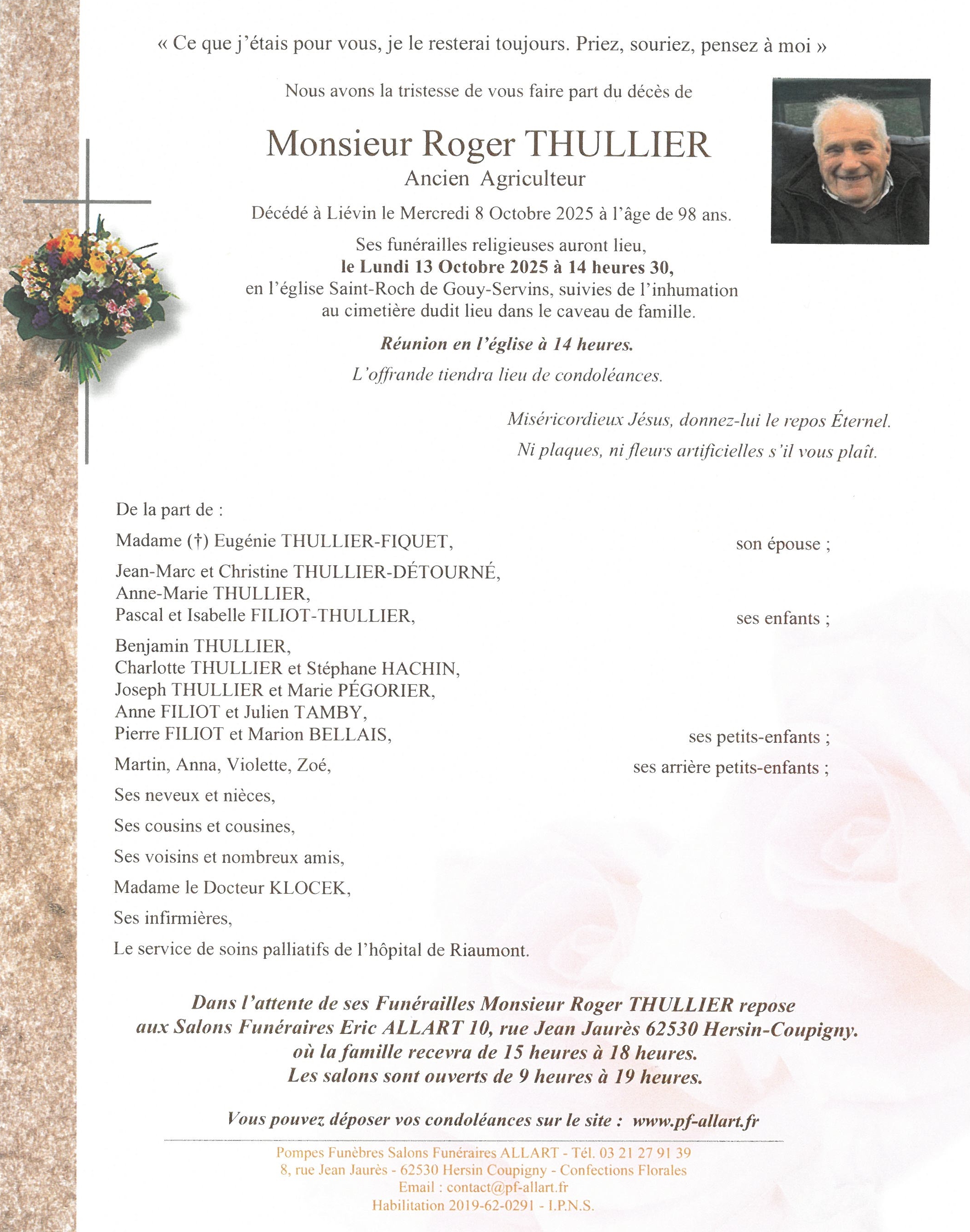 C’est avec une grande tristesse que nous vous annonçons le décès de Roger THULLIER survenu le mercredi 08 octobre 2025 à Liévin.